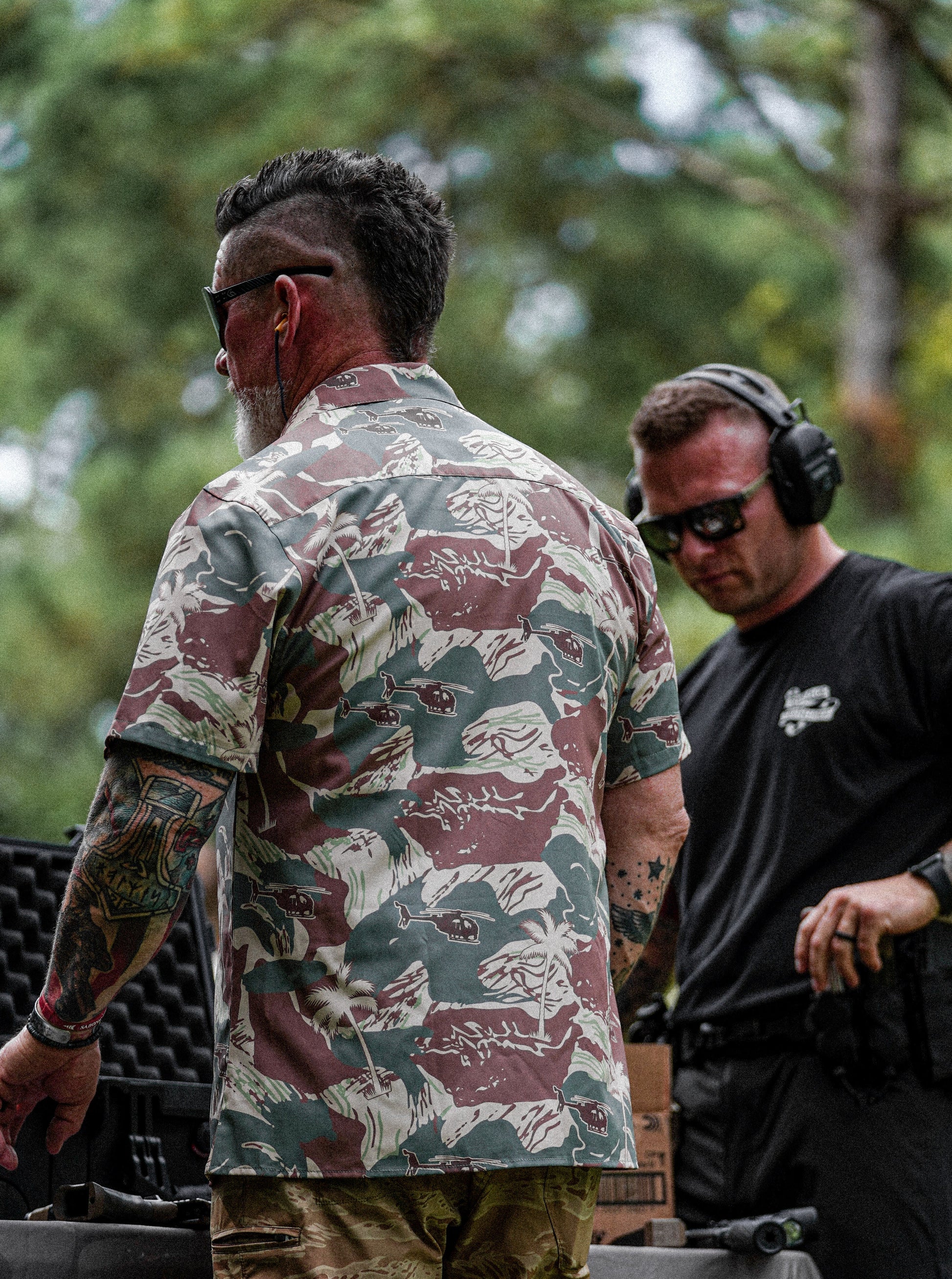 Stay sharp and comfortable with the Brushstroke button-up, designed for those who demand performance and style. Crafted from a durable polyester/spandex blend, this short-sleeve oxford features a relaxed fit and snap buttons for quick action. Its weighted inner pockets ensure a smooth sweep-to-weapon motion (weight not included), while the breathable fabric keeps you cool. The multi-color green and tan camo pattern adds tactical edge, making it perfect for any mission—whether with the family or the crew.