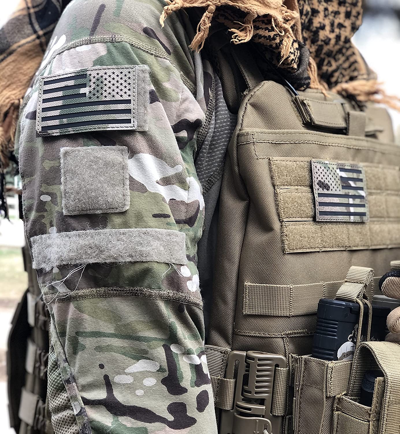 This is for TWO of the US Flag patches in the multi camo pattern. It comes with the forward facing and rear facing. It has hook and loop on the back to attach to each side of your helmet, jacket or tactical vests. It reflects light to identify your friendly friends