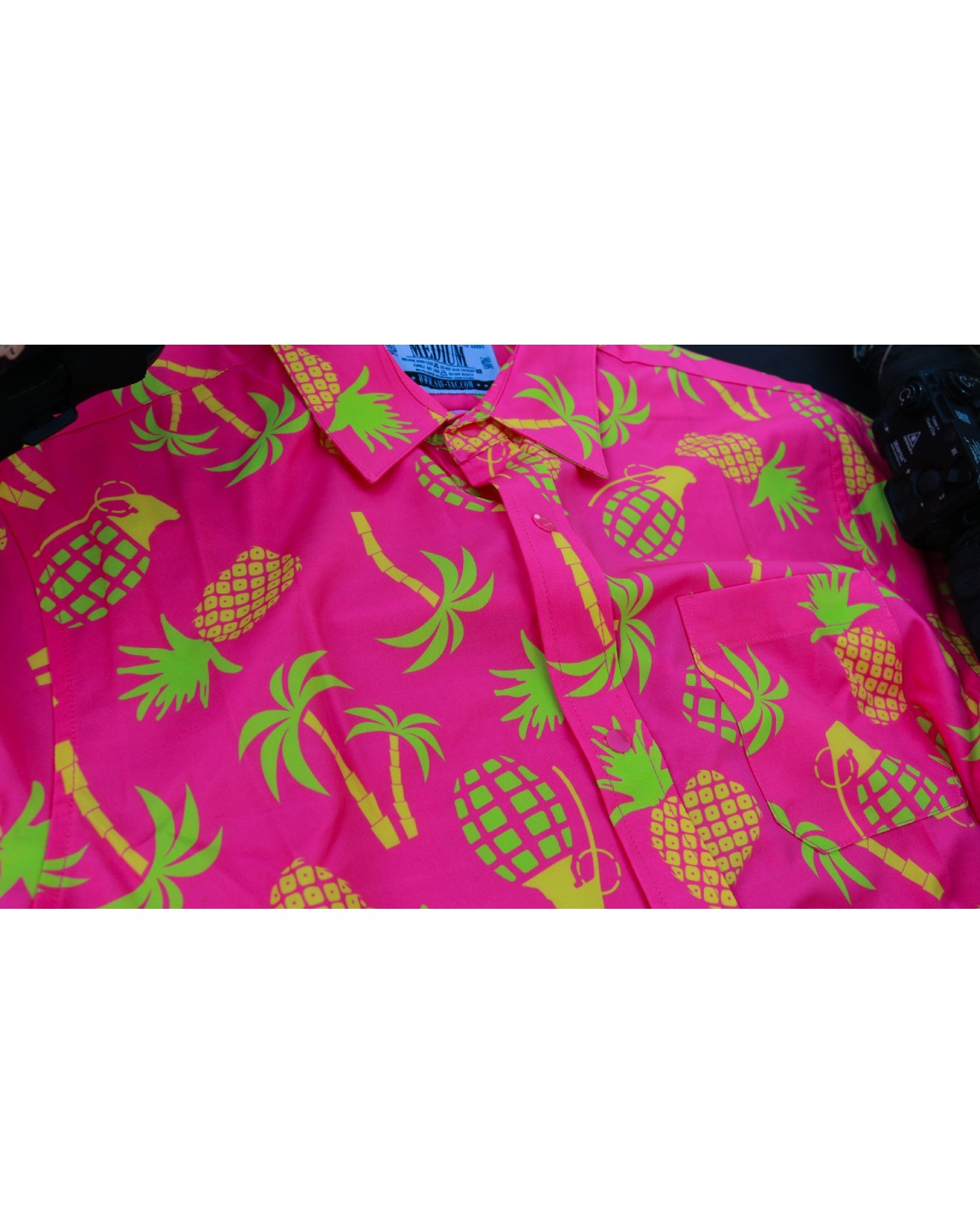 The Tropic Like Its Hot button-up turns up the heat with a bold hot pink tropical munition pattern that commands attention. Built from a polyester/spandex blend, it offers extreme comfort and durability in a lightweight, breathable short-sleeve oxford. Snap buttons and a relaxed fit keep you ready for action, while weighted inner pockets enable a smooth sweep-to-weapon draw (weight not included). Complete with a left breast pocket, this shirt keeps you deadly fresh whether you’re on vacay with the fam or out with the boys.