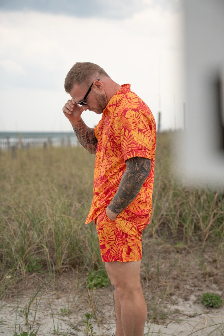 The Tropical Inferno fuses a short-sleeve oxford style with a rugged Polyester/Spandex blend for unmatched comfort and durability. Its relaxed fit and snap buttons deliver effortless cool, while weighted inner pockets ensure a seamless sweep-to-weapon (weight not included). Lightweight, breathable, and featuring a left breast pocket, this shirt channels a tropical vibe that keeps you deadly fresh whether you're on vacay with the fam or out with the boys. Tactical edge meets island heat—stay sharp, stay lethal.